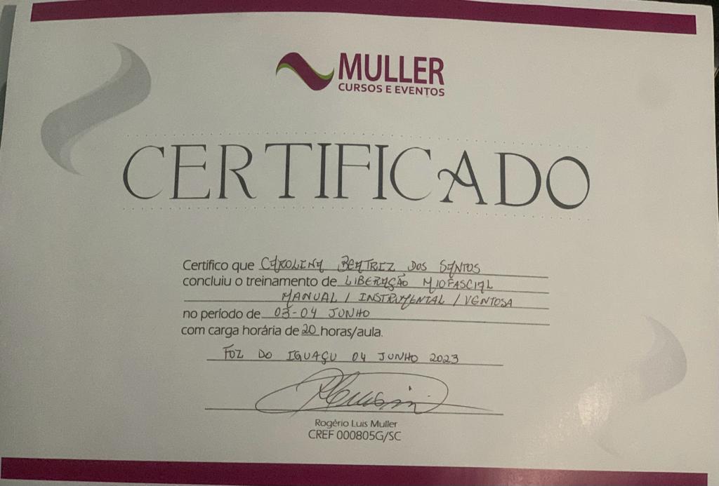 Do dia 03/06/2023 ao dia 04/06/2023 realizei um curso de Liberação Miofascial Manual, Instrumental e com Ventosa, totalizando 20 horas.